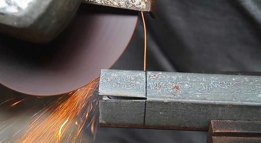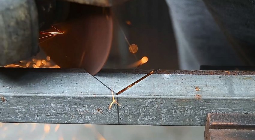Теперь болгаркой нужно разрезать центральную стенку, чтобы получить 2 язычка. Боковые половинки стенок, примыкающие к этим усикам, удаляются.