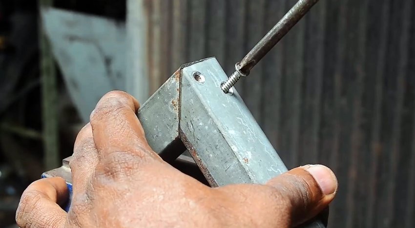 Теперь нужно зачистить заусенцы, и согнуть трубу. Чтобы она выгнулась как нужно, следует ее подбивать молотком. В конце она фиксируется заклепкой, установленной через оставленный язычок.