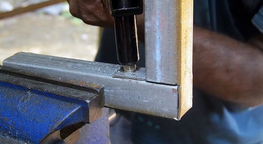Теперь трубки с закладными складываются в угол, после чего просверливаются и стягиваются саморезами.