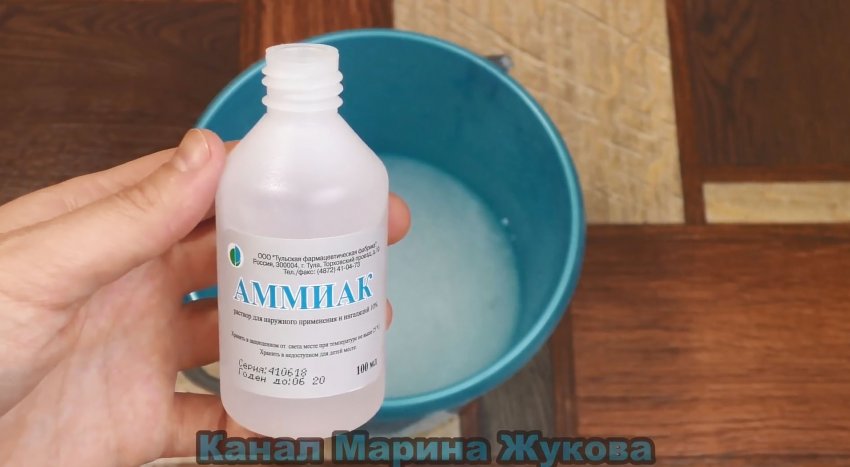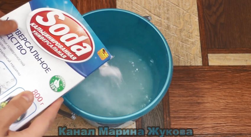 В емкость набирается 1 л горячей воды, затем добавляется 3 ст.л. кальцинированной соды и 1 ст.л. аммиака.