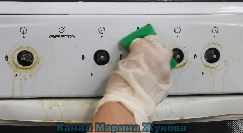После раствора он будет сходить буквально за одно движение. После этого ручки и накладки ополаскиваются, и устанавливаются обратно. Применяя этот способ, можно вычистить плиту до идеала практически не прикладывая усилий, и не рискуя поцарапать эмаль на плите или пластик ручек.