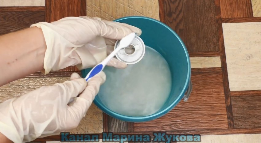 Вымоченные в чистящем растворе ручки нужно немного поскрести зубной щеткой, чтобы окончательно убрать размякший толстый слой жира.