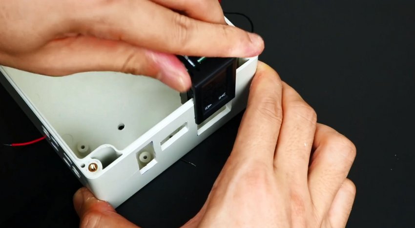 Затем требуется подобрать монтажную пластиковую коробку, в которую поместятся аккумуляторы и инвертор. В коробке прорезаются окна для монтажа вольтметра с амперметром, кнопки и штатной розетки с инвертора.
