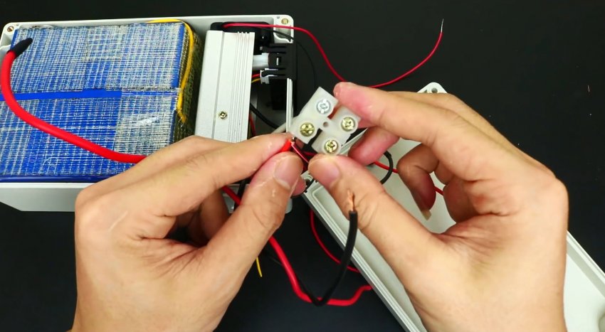 Аккумуляторы соединяются последовательно, чтобы повысить общее напряжение до 12 В, и подключаются к контроллеру.