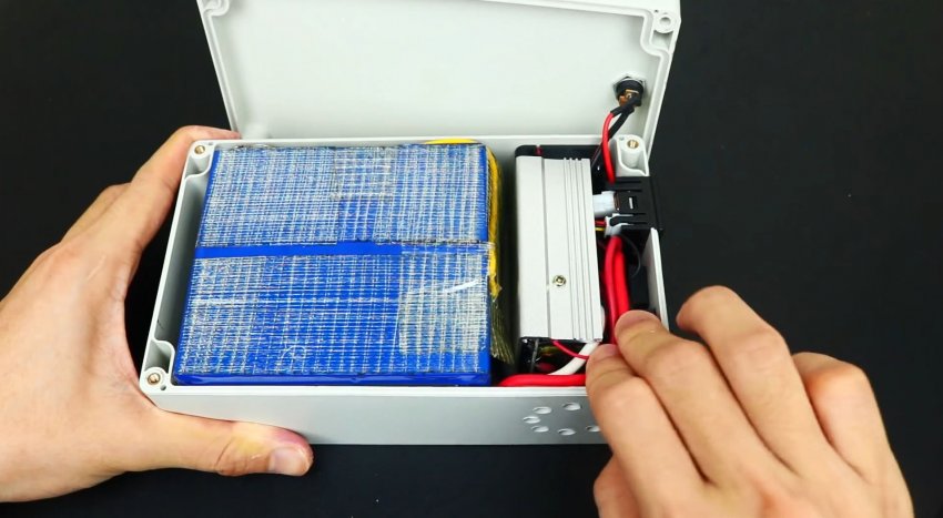 На дно прикручивается инвертор, и сбоку устанавливаются батареи.
