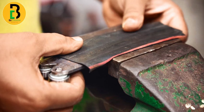 Между отверстиями выполняем угловую выемку вершиной, направленной в тело материала, срезаем углы стальной полосы и скругляем острые края. Ручным напильником сглаживаем кромки.