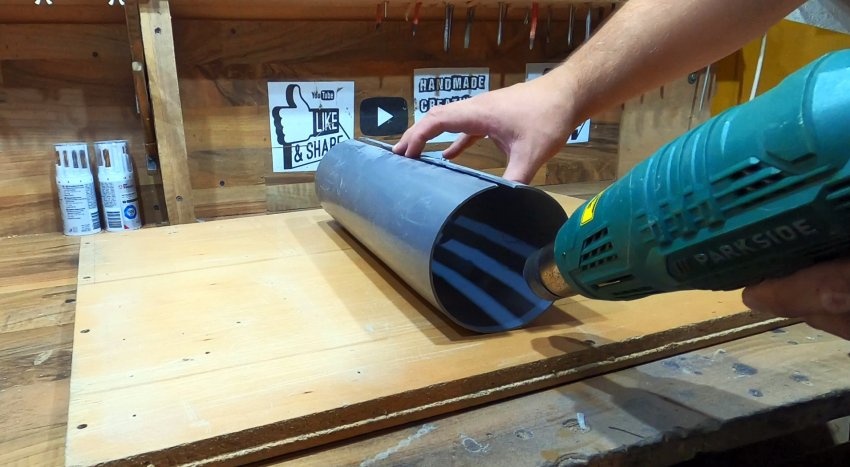 Нагреваем материал разрезанной трубы равномерно по всей внутренней поверхности строительным феном на 300-550 градусов Цельсия, добиваясь распрямления пластика.