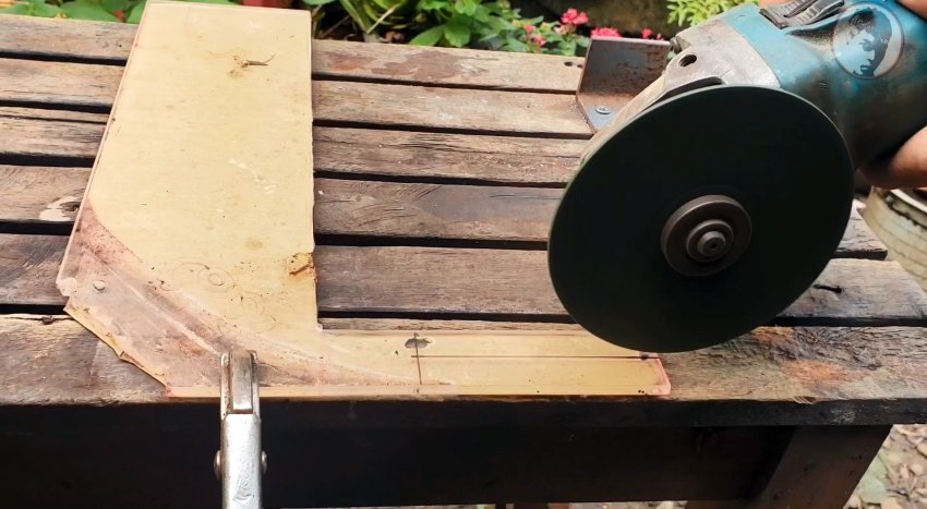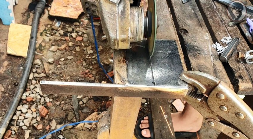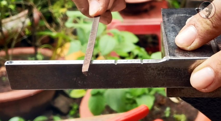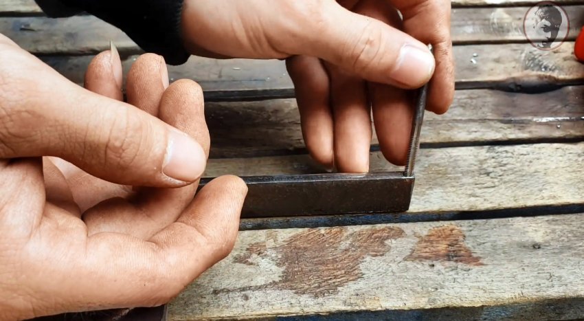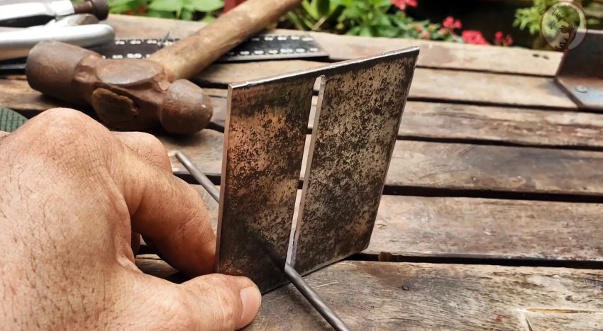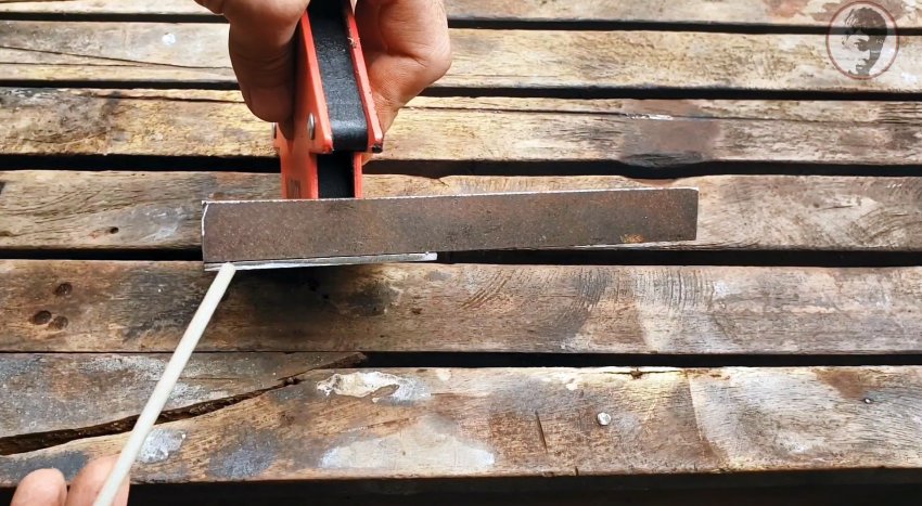 От полосы толщиной 5 мм отрезаем заготовку 175?20 мм. Используя магнитный фиксатор, привариваем полосу на ребро вдоль короткой стороны прямоугольной пластины. Болгаркой шлифуем сварные швы.