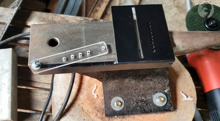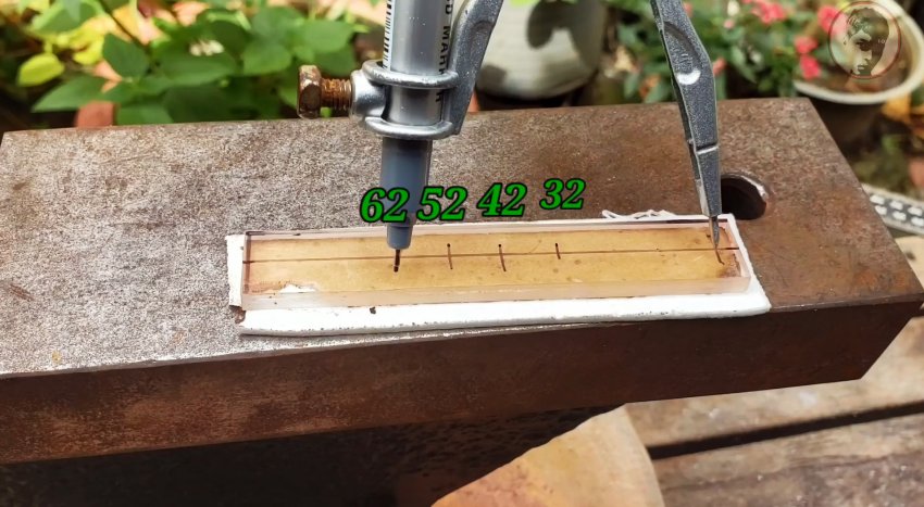 Окрашиваем металл разметки аэрозольной краской и после высыхания прикручиваем пластину из оргстекла к отверстию с резьбой на стальной полосе подпружиненным винтом.