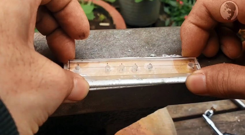 В этих точках сверлим отверстия, включая и общую точку. Шлифуем пластину из оргстекла и скругляем углы наждачной бумагой. Удаляем растворителем с пластины метки и частицы.