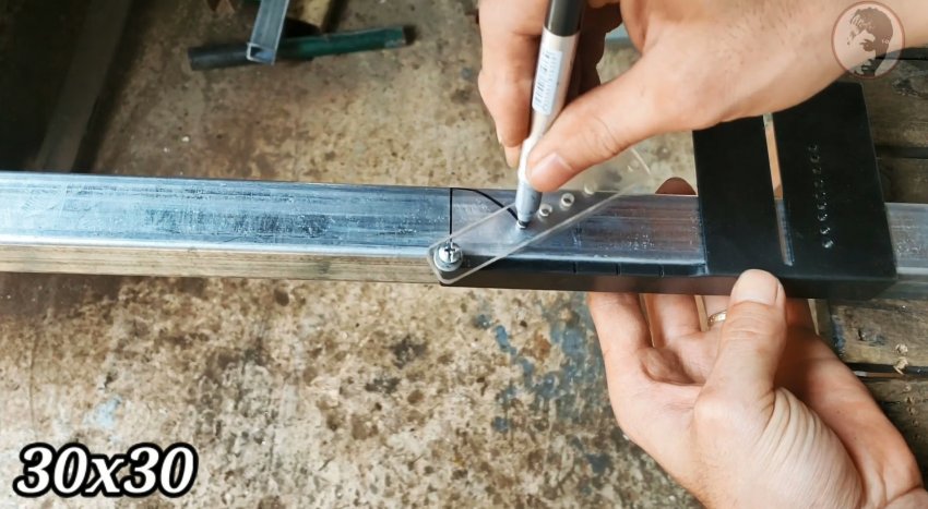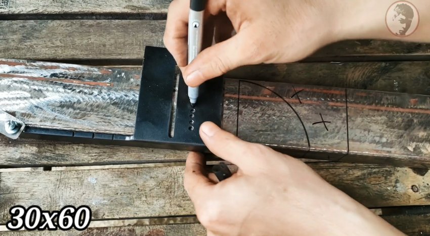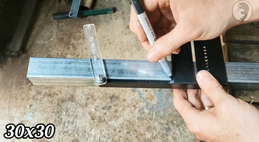 Величину R/2, которая нужна для разметки, легко находим, если прижать полосу с метками к стороне профильной трубы и маркером через соответствующее отверстие в металлической пластине нанести на поверхность трубы метку.
