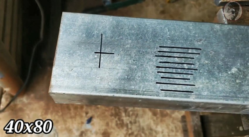 Метки на полосе углубляем напильником. На пластине параллельно прорези проводим линию и по вертикали делаем метки на расстоянии от полосы R/2, где R – сторона профильной трубы. Для трубы 30?30 мм оно будет равно: 30/2=15 мм, 40?40 мм – 20 мм, 50?50 мм – 25 мм, 60?60 мм – 30 мм, 40?80 мм – 40 мм и т. д. Сверлим по этим меткам отверстия.
