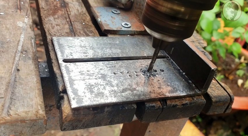 На свободном конце полосы со стороны пластины сверлим глухое отверстие, нарезаем резьбу и вкручиваем винт.