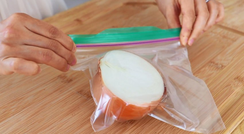 Если вы планируете использовать только половинку луковицы, тогда не очищайте ее, а разрежьте надвое. Лишняя половинка должна остаться в шелухе. Ее следует поместить в пакет, выгнать из него воздух и закрыть. Она сможет пролежать в холодильнике не испортившись до 2 недель.