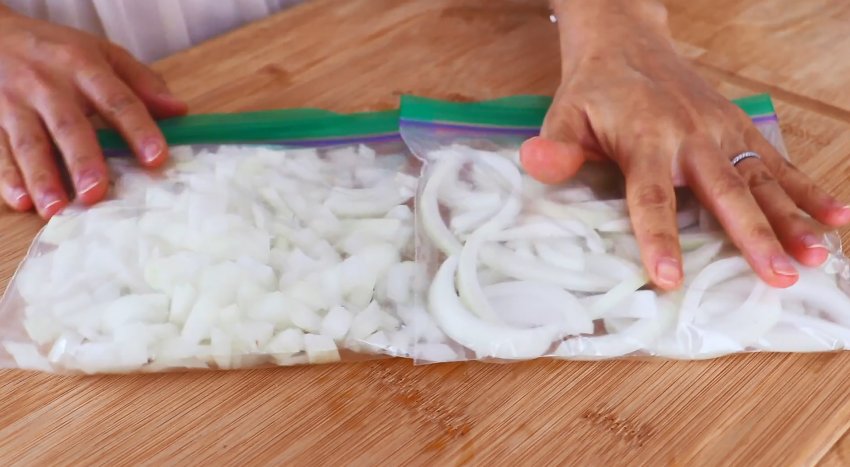 Лук можно измельчить, и разложить по пакетам. Такие пакетики закрываются и замораживаются. Измельченный лук может пролежать в морозилке до 6 месяцев. Он подходит для жарки или супа. Для салатов его лучше не применять, так как после разморозки он становится мягким.