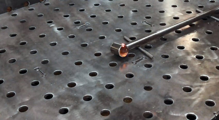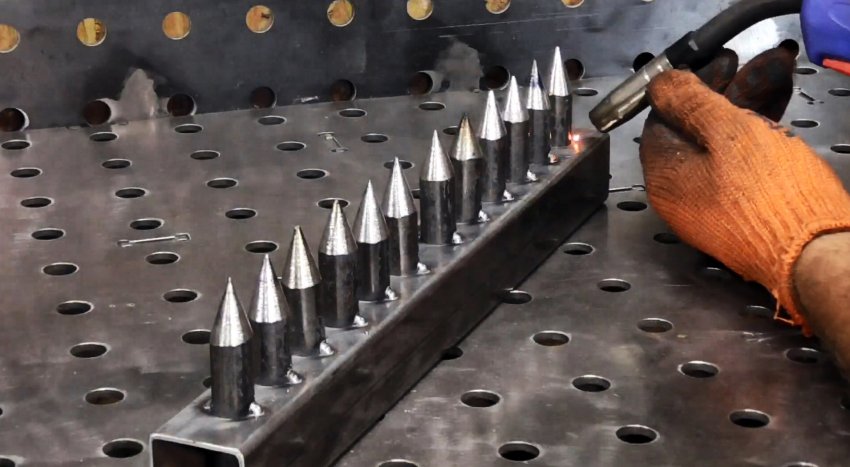 Вставляем стержни тупыми концами в квадратную трубу с отверстиями до упора в противоположную стенку и привариваем их в таком положении.