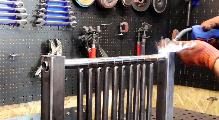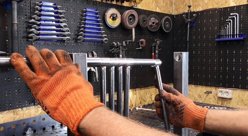 Устанавливаем второй конец трубы с нанизанными втулками на место и в таком положении привариваем ее к вертикальным стойкам. Длинные стержни должны свободно колебаться вокруг трубы в обе стороны.
