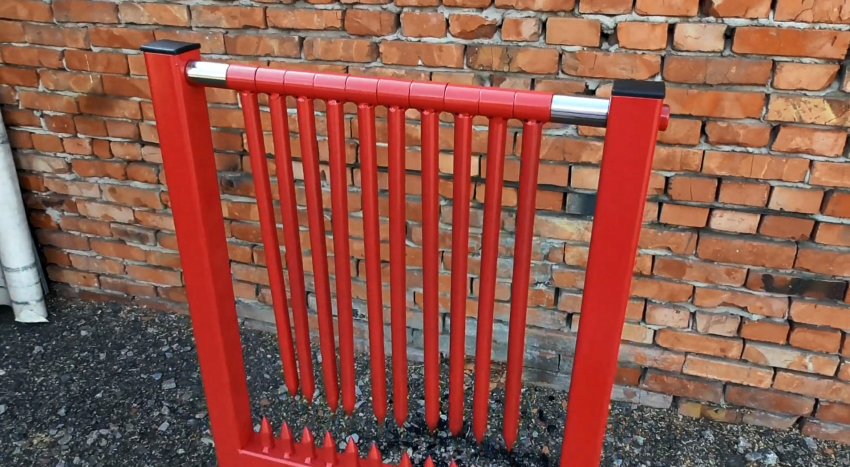 В сквозные отверстия наверху вертикальных стоек вставляем стальную круглую трубу и на нее нанизываем втулки с приваренными к ним длинными заостренными стержнями, предваряя и заканчивая нанизывание втулками без стержней.
