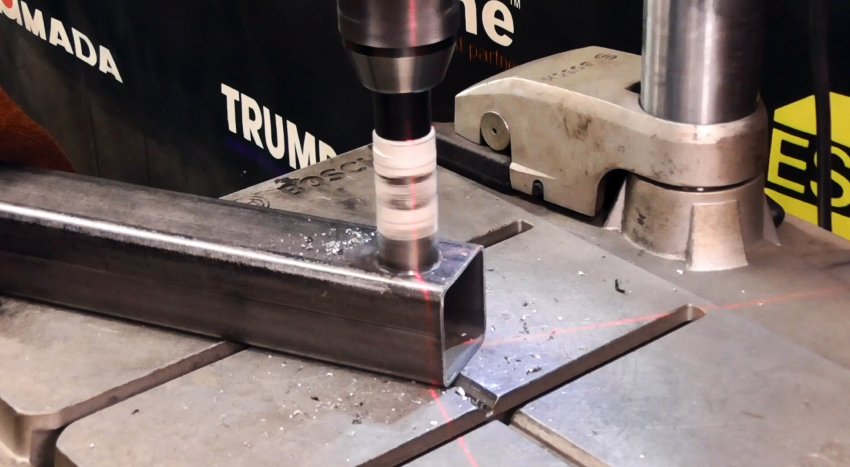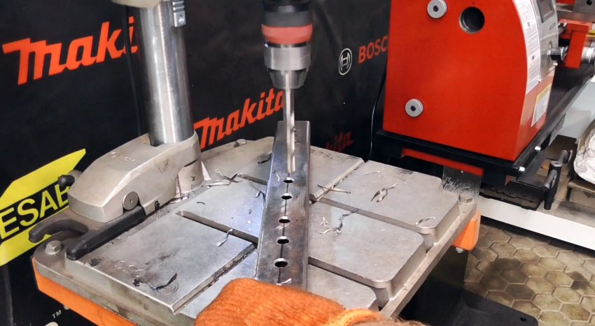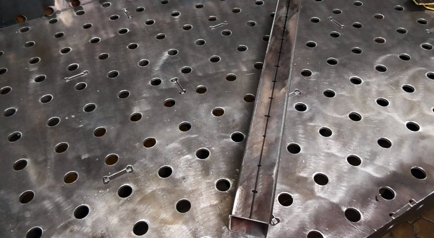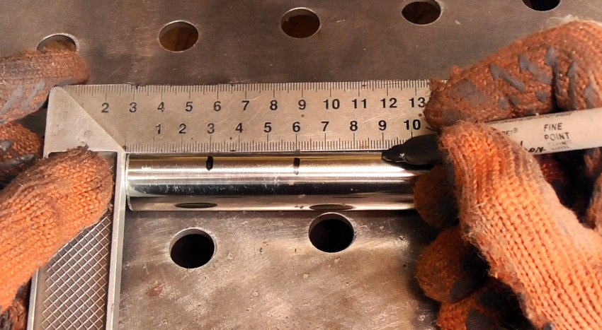 Проводим осевую линию по одной из сторон заготовки из квадратной трубы, намечаем равноудаленные места сверлений и выполняем их на сверлильном станке.