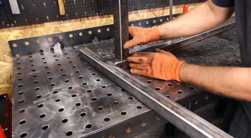 Продолжаем сборку силовой рамы держателя бревна, используя сборочно-сварочный стол, магнитные фиксаторы, струбцины и сварку. Она должна состоять из вертикальной стойки и горизонтальной упорной рамы.