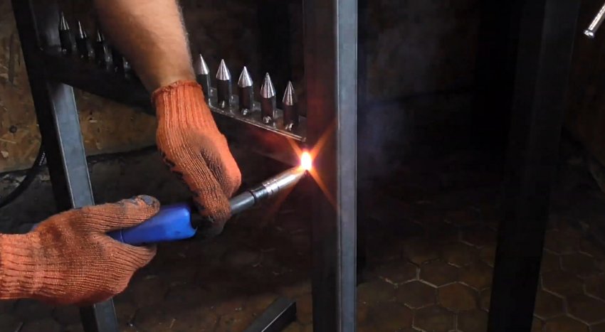 Вставляем заготовку с заостренными стержнями в горизонтальном положении между стойками силовой рамы на расчетной высоте от пола и привариваем.