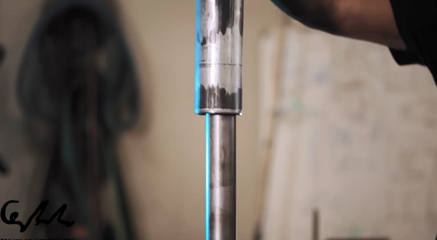 Обрабатываем внешнюю сторону старой трубы болгаркой, формируем ее длину под необходимый размер с помощью ленточной пилы, вставляем в патрон токарного станка с люнетом, торцуем и протачиваем один конец под конус.