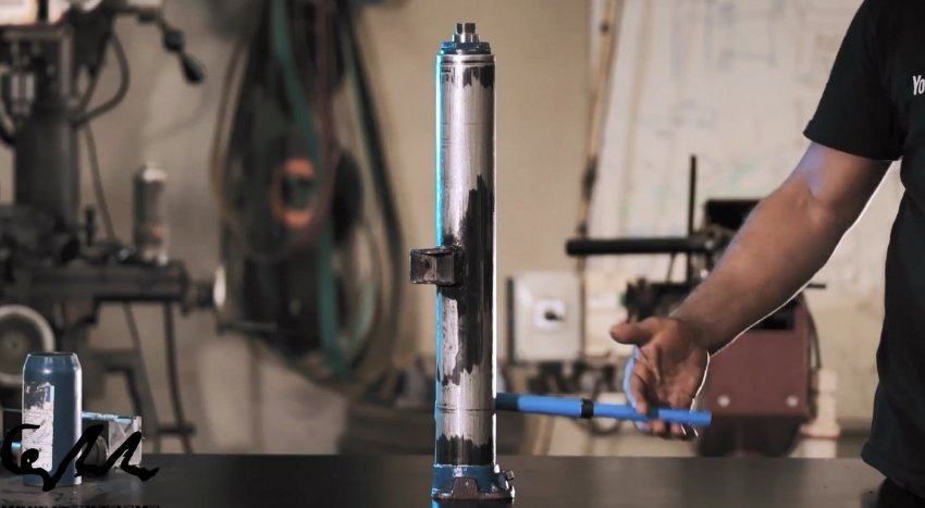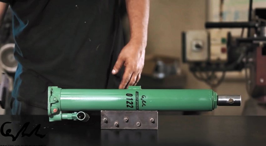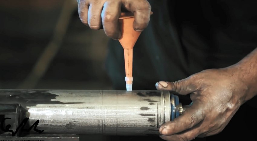 Выливаем из корпуса, служащего еще масляным резервуаром, рабочую жидкость. Снимаем корпус, поршень с уплотнителями и цилиндр.