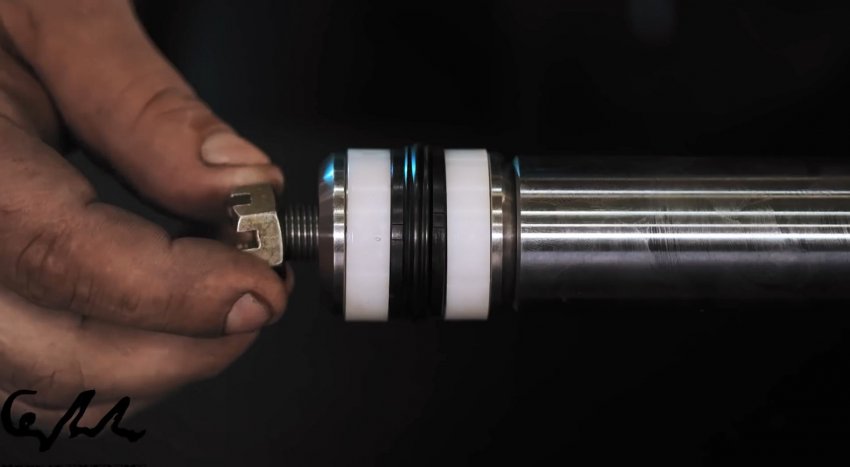 На один конец стержня-поршня надеваем новый уплотнительный узел, закрепляем его корончатой гайкой и контрим.