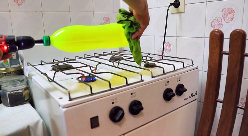Далее вентиль зажимается в патроне шуруповерта. Нужно вращать накаченную бутылку над зажженной газовой конфоркой. Она разогреется, размягчится и благодаря внутреннему давлению выровняется.