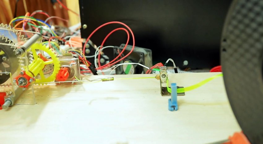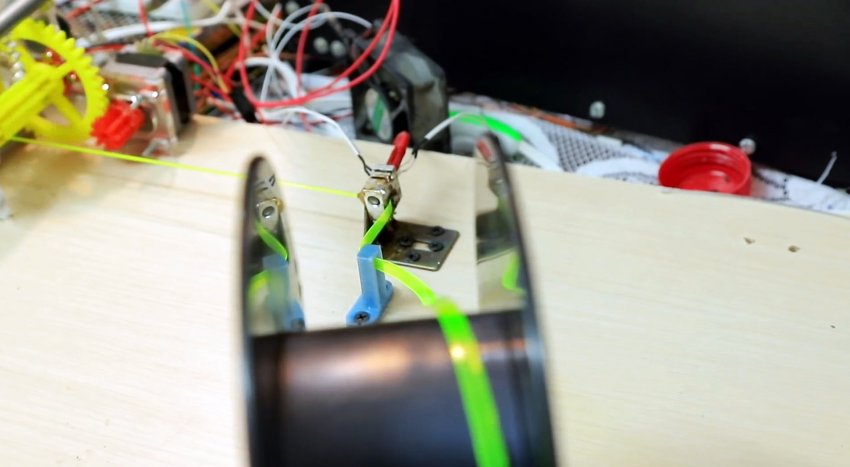 Протянутый сквозь горячее сопло край филамента нужно завязать, и соединить с протяжным и намоточным механизмом. Тот представляет собой шаговый двигатель с редукторами и катушкой. Детали для него можно напечатать на принтере. Скорость намотки делается регулируемой, чтобы лента успевала достаточно нагреваться и менять форму.
