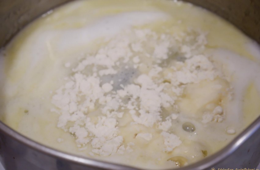 2. Выключаем огонь, добавляем муку, хорошенько перемешиваем массу.