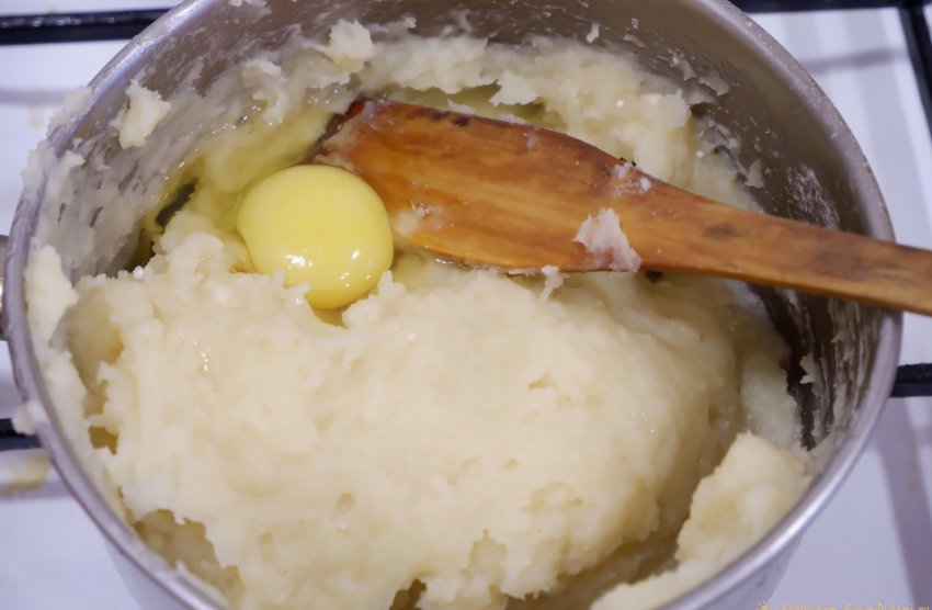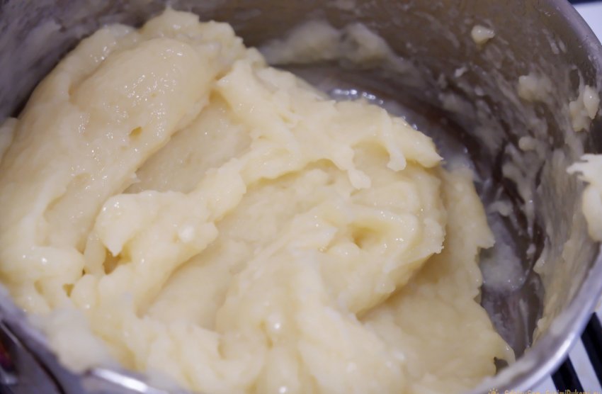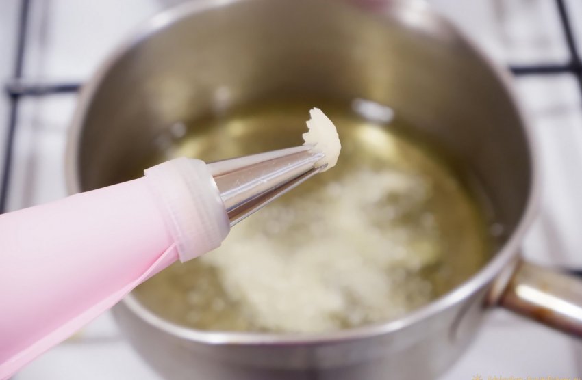 5. Помещаем тесто в кулинарный мешок и выдавливаем тесто в кастрюлю с разогретым маслом.