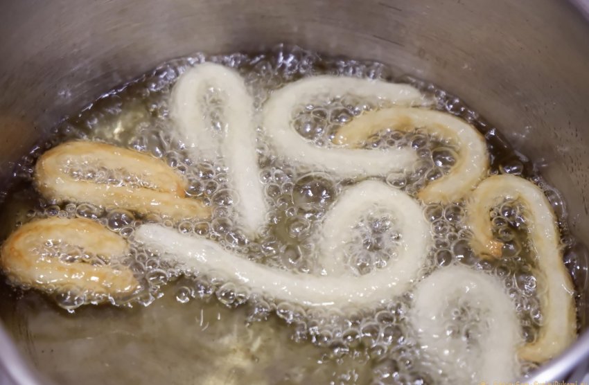 Жарим до золотистого оттенка. Выкладываем чуррос на бумажное полотенце, чтобы удалить излишки масла.