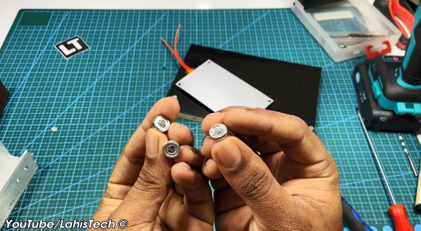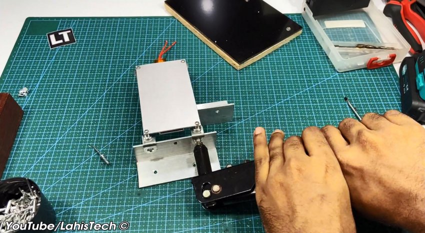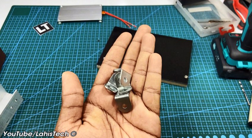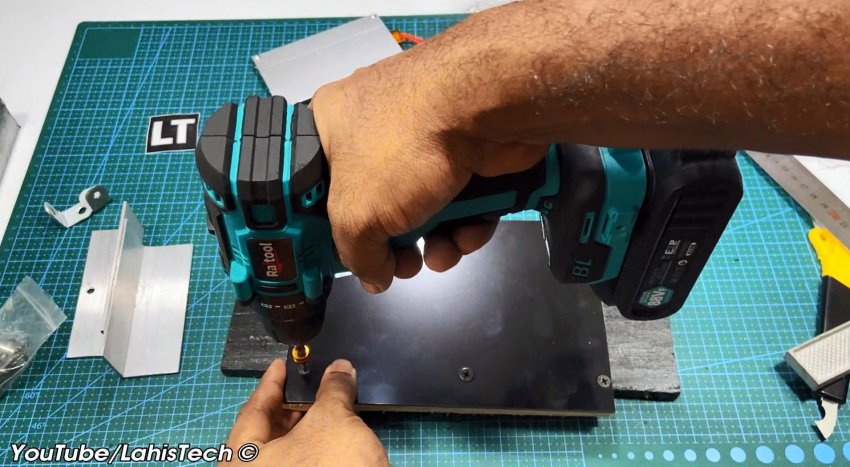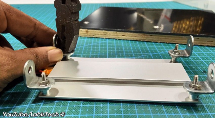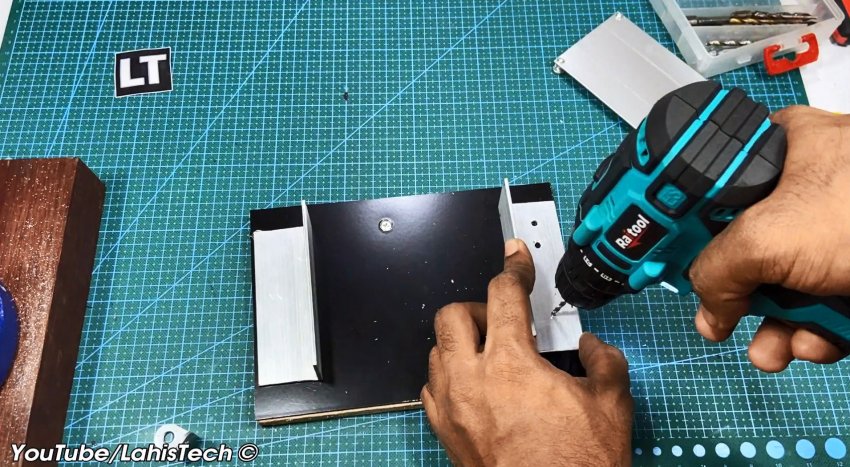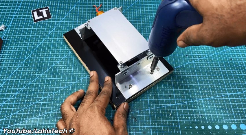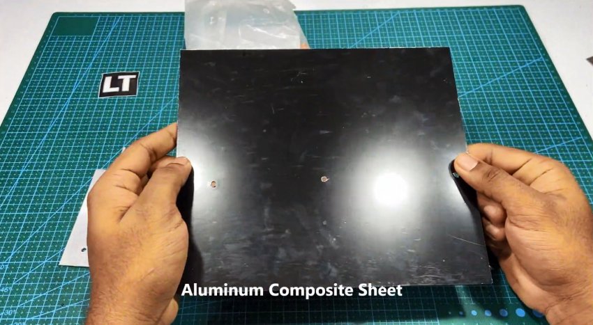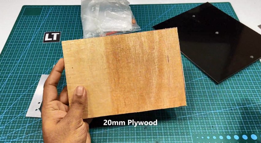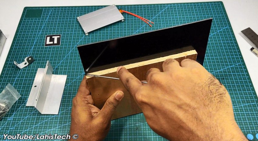 В качестве опоры для панели используют алюминиевые уголки. Для опорной площадки потребуется кусок 20 миллиметровой фанеры, размером примерно 200х150 мм, и такого же размера композитная пластина (гетинакс, текстолит или алюминия).