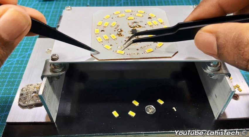 Повсюду применяют устройства и приборы содержащие SMD компоненты. Сегодня все светодиодные светильники сделаны по LED технологии. Излучающие световой поток элементы — не что иное, как светодиоды. Как любой полупроводниковый SMD элемент, светодиод может выйти из строя. Замена элементов с помощью паяльника очень трудоемкий процесс, ведь размеры корпуса составляют несколько миллиметров. Кроме того, в результате перегрева микрокомпонент может просто выйти из строя. Хороший фен для пайки довольно дорогое удовольствие, которым нужно еще уметь пользоваться.