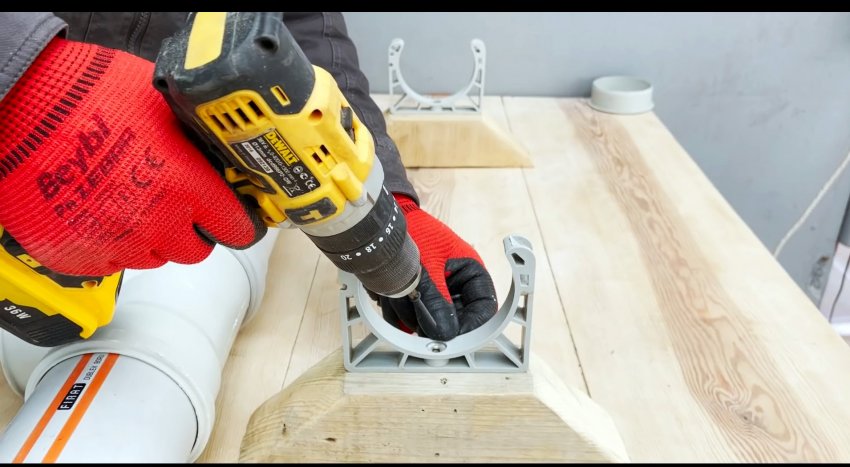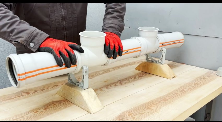 На некотором расстоянии по горизонтали устанавливаем поперечно две одинаковые призматические подставки из дерева. К ним сверху закрепляем шурупами по одному пластиковому хомуту, в которые помещаем собранную из патрубков и тройников конструкцию, и защелкиваем душки хомутов.