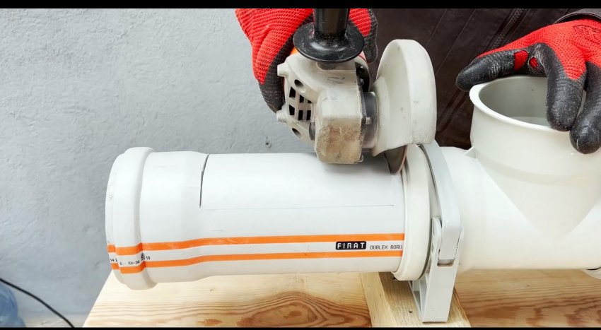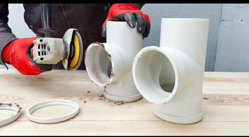 От отводов тройников отрезаем кольца по внешнему буртику и зачищаем линии реза по окружности.