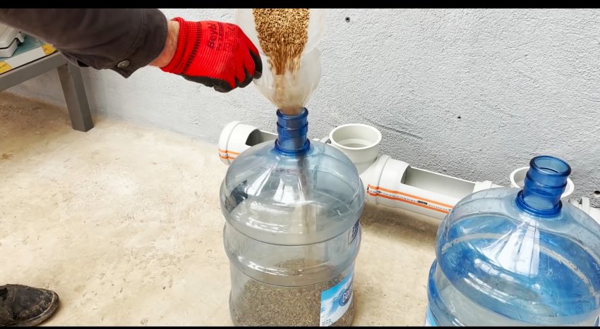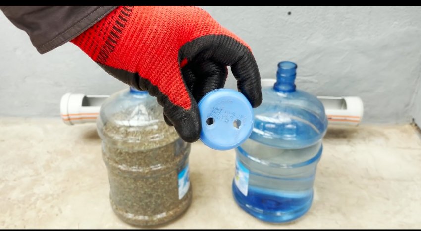 В крышке емкости для воды сверлим два небольших отверстия, заливаем в бутыль воду.