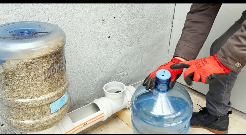 Емкость с водой помещаем в отвод тройника, в который вставлена с натягом заводская заглушка. Горловину емкости с фуражом помещаем в свободный отвод.