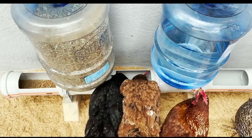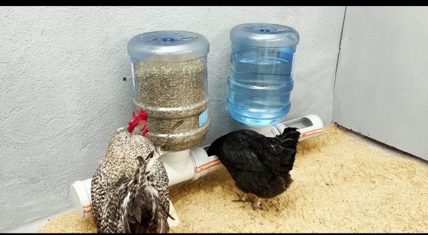 Прожорливость кур общеизвестна и по этой причине им всегда нужен корм, а также вода, чтобы смочить горло и утолить жажду. Кормление и поение этих птиц занимает много времени и сил. Сделав несложную конструкцию из патрубков и тройников ПВХ, а также ПЭТ-бутылей на 20 литров, и задав один раз в день курам корм и воду, можно больше не беспокоиться до 3-7 дней.