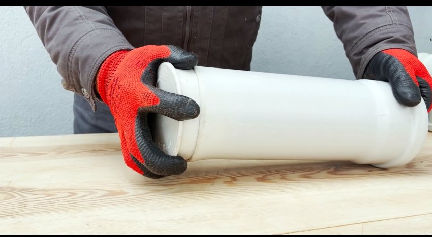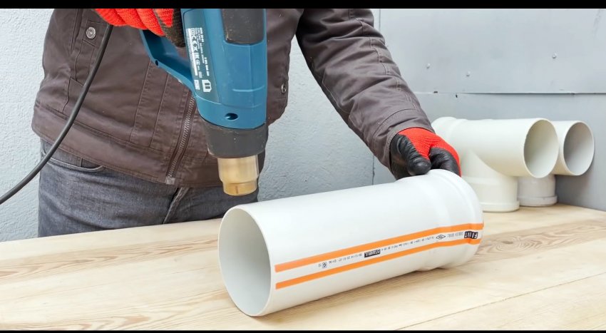 Устанавливаем на строительном фене режим 630 градусов Цельсия и осторожно, соблюдая дистанцию, разогреваем конец патрубка до размягчения (но не потери формы!) и вставляем пластиковую заглушку до упора.
