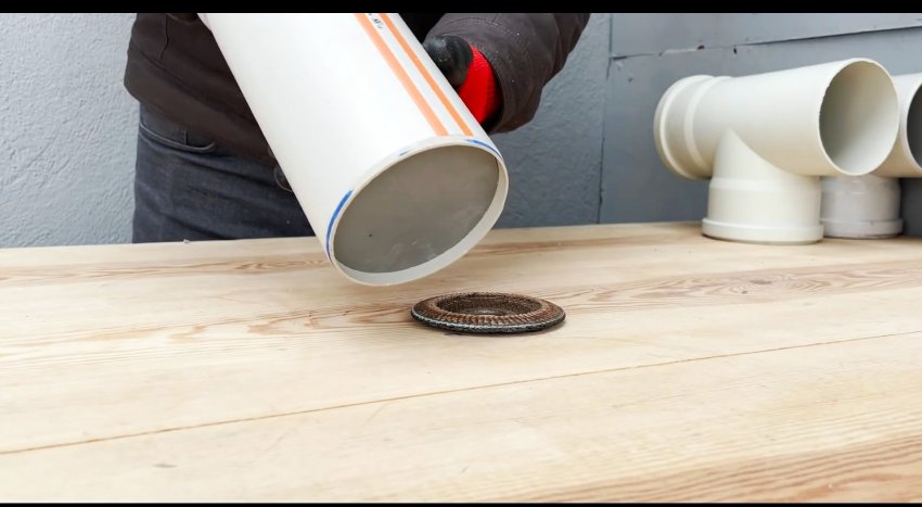 Обработав кромки, укладываем заглушку на диск болгарки и давим на патрубок. В результате заглушка оказывается в патрубке на некотором расстоянии от торца.