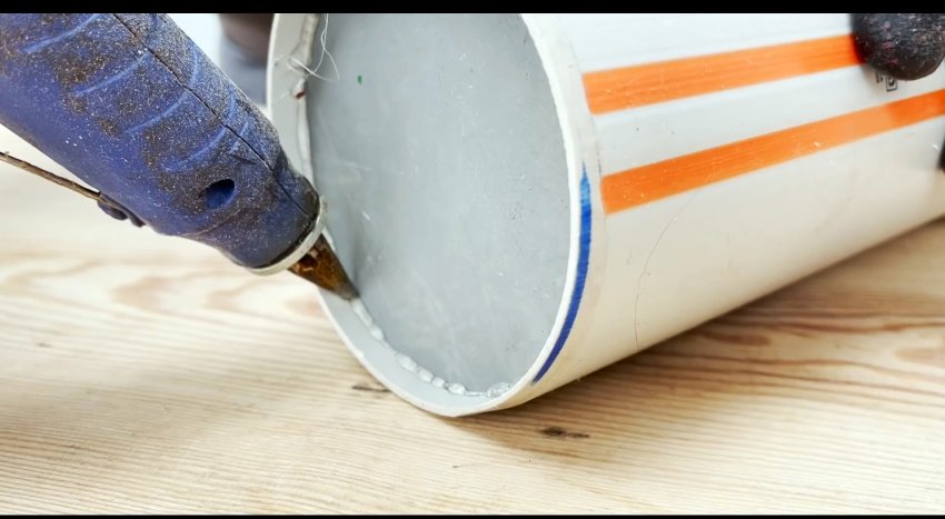 Линию контакта патрубка и заглушки заполняем клеем для склеивания пластика.