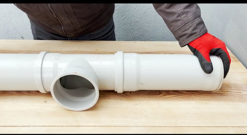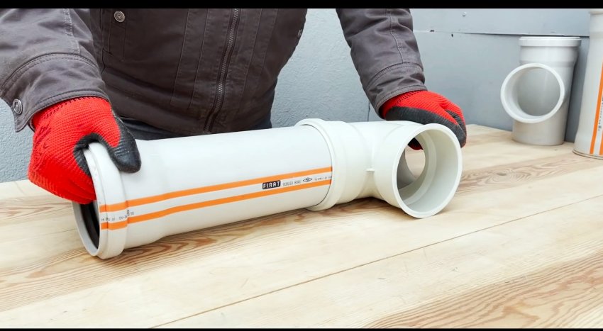 В раструб тройника, убедившись в наличии уплотнительного кольца, вставляем патрубок без заглушки. Патрубок с заглушкой из пластикового листа раструбом надеваем на другой конец первого тройника.
