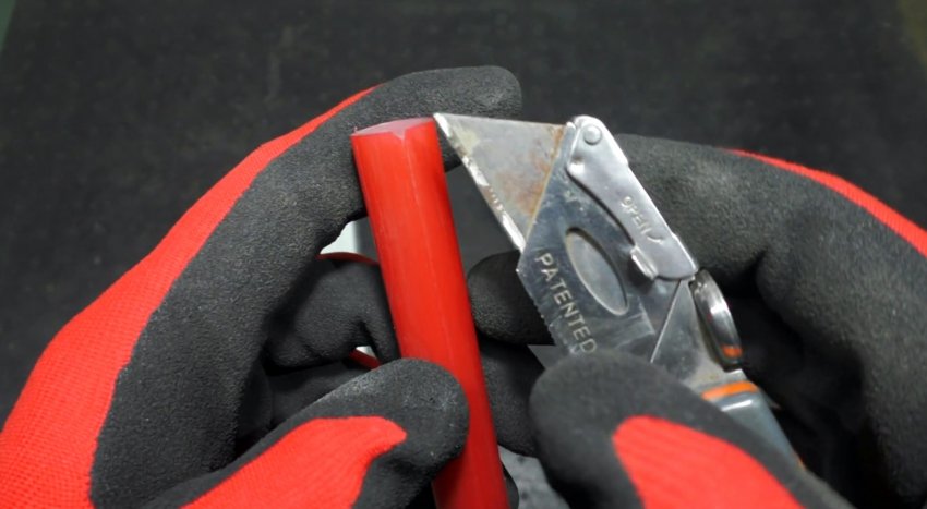 Чтобы удерживать постоянно одинаковый угол заточки, нужно взять отрезок трубки для теплых полов длиной 15 см. Его необходимо разрезать по одной стенки вдоль.