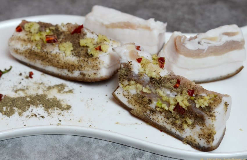 13. Боковые части сала промазывают черным перцем. А красный перец и чеснок размещают преимущественно сверху.