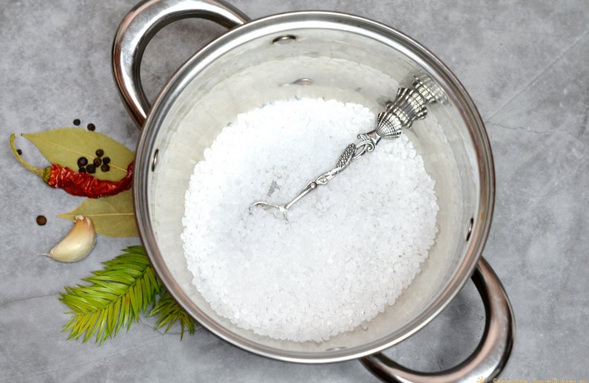 5. Отмеряют 150 грамм соли. Это соответствует шести столовым ложкам – без горки. Соль высыпают в маленькую кастрюлю.