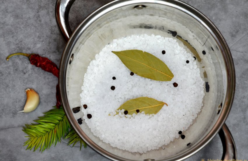 6. Кладут в кастрюлю лавровые листья, два вида пряного горошка.