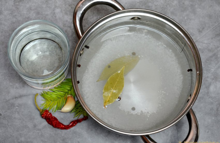 7. Наливают литр воды, рассол кипятят 5 минут на среднем огне.