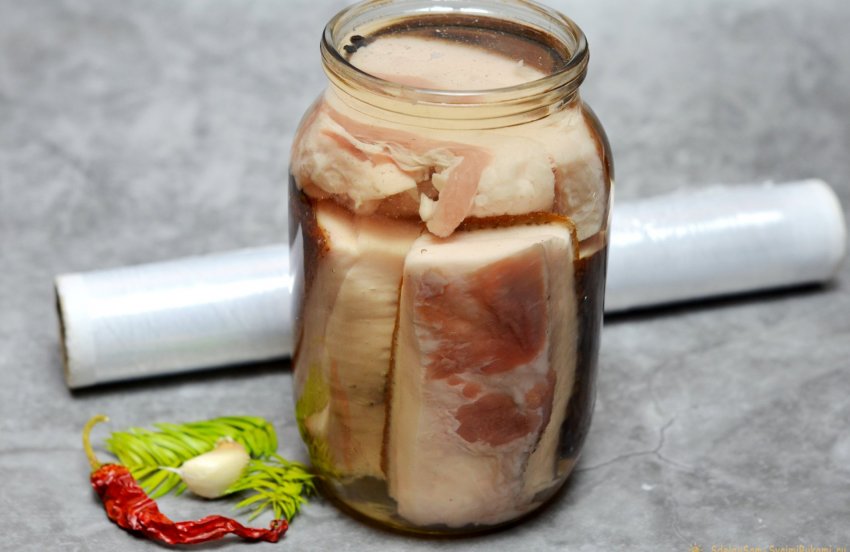 9. Горлышко банки затягивают пищевой пленкой не до конца, четверть горлышка остается открытой. Сало в рассоле настаивается 4 дня: 2 дня – на кухонном столе, 2 дня – холодильнике. Когда банку ставят в холодильник, горлышко полностью затягивают пленкой.